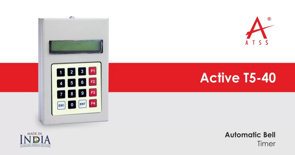 The device stores these schedules in its memory. At each programmed time, it sends a signal to an electric gong, siren, or bell — ringing it automatically. Advanced models like the Active-T5-40 feature: